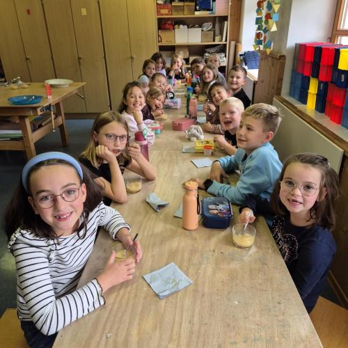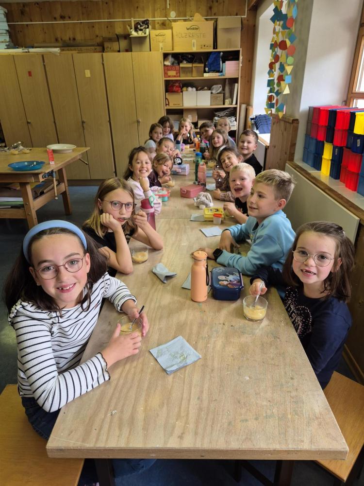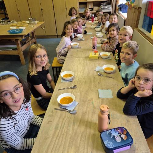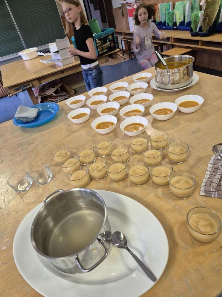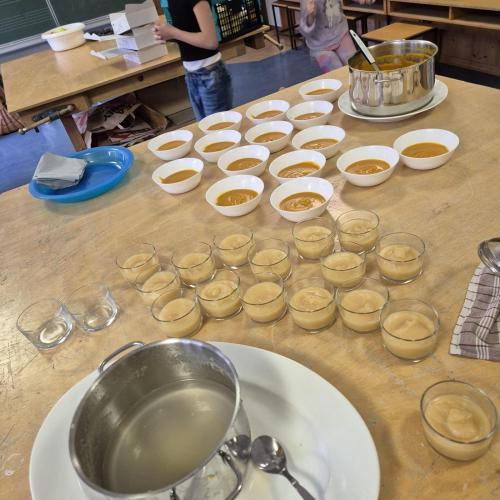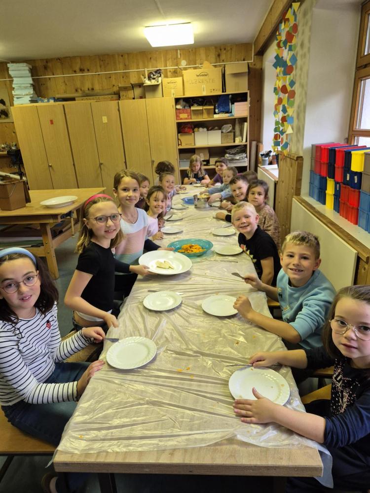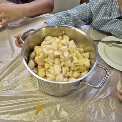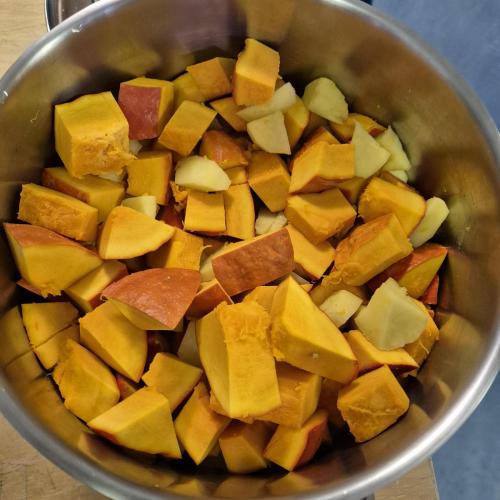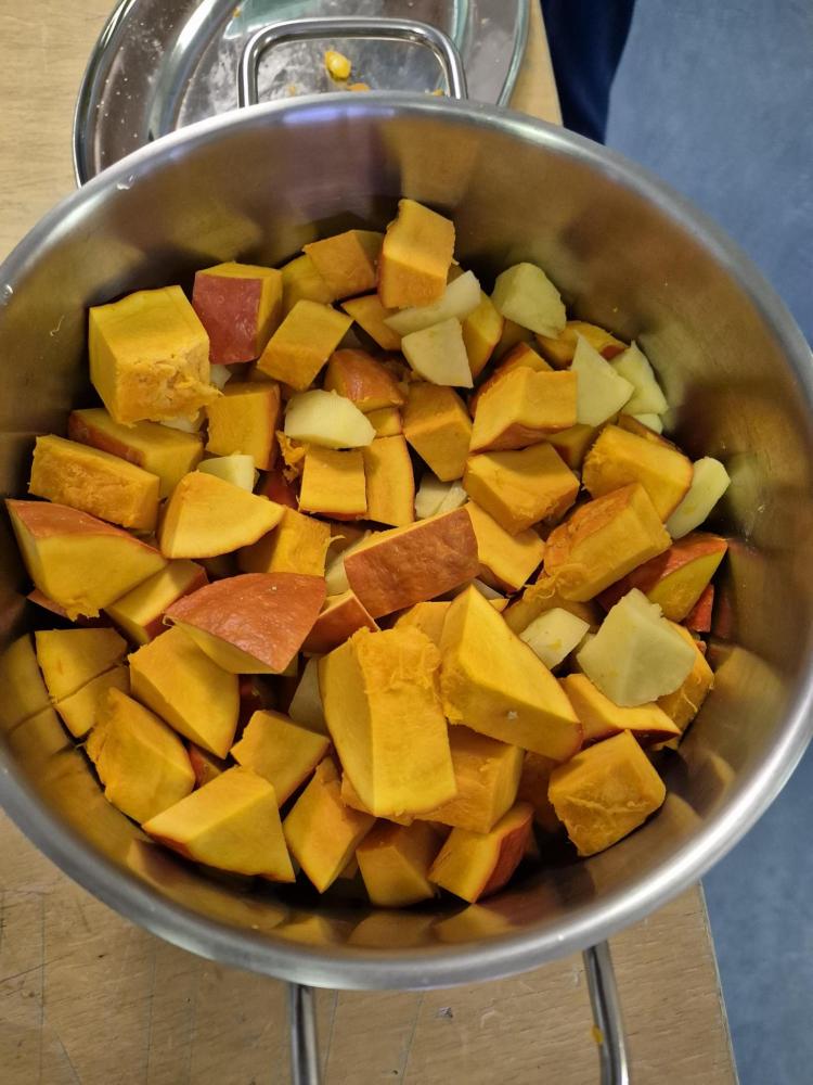 Am Donnerstag, 09.10.25, verarbeiteten wir Teile aus unserem Erntedankkorb zu leckeren Speisen. Aus dem Kürbis wurde eine köstliche Suppe und aus den Birnen und Äpfeln ein leckes Mus.